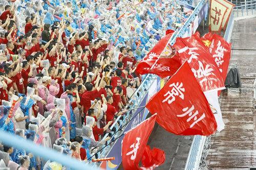 2025年6月21日晚,常州队主场对战南京队。虽然最终常州队0∶4告负,常州球迷大雨中观赛热情不减。(图片由常州发布提供)